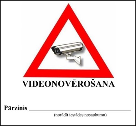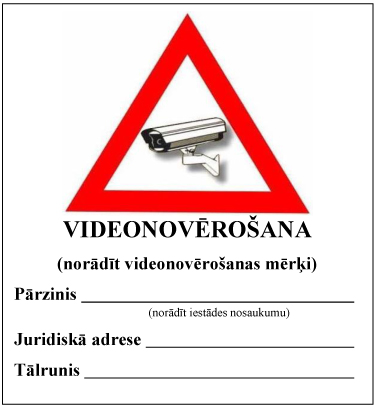 8. Par novērošanu, izņemot šo noteikumu 8.1 punktā minētajā vietā, brīdina ar informatīvo zīmi (1. pielikums), kuru veido novērošanas videokameras attēls 35 grādu leņķī uz balta fona, ko apņem sarkana robežlīnija vienādmalu trīsstūra formā. Trīsstūra vienas malas garums ir 145 mm, malas platums – 12 mm. Zem trīsstūra atrodas uzraksts ar melniem burtiem "VIDEONOVĒROŠANA". Zem tā norāda videonovērošanas mērķi, pārziņa nosaukumu, adresi un kontakttālruni. Informatīvās zīmes izmēru var proporcionāli palielināt vai samazināt.