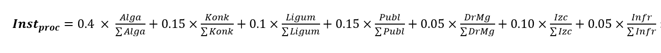 Instproc – zinātniskajai institūcijai piešķiramais bāzes finansējuma īpatsvars no kopējā piešķiramā bāzes finansējuma apmēra.