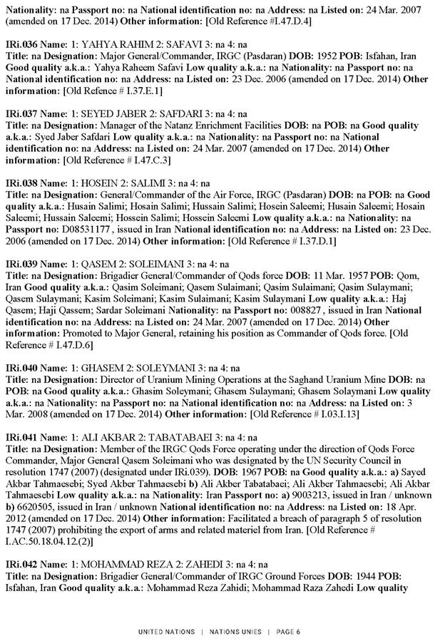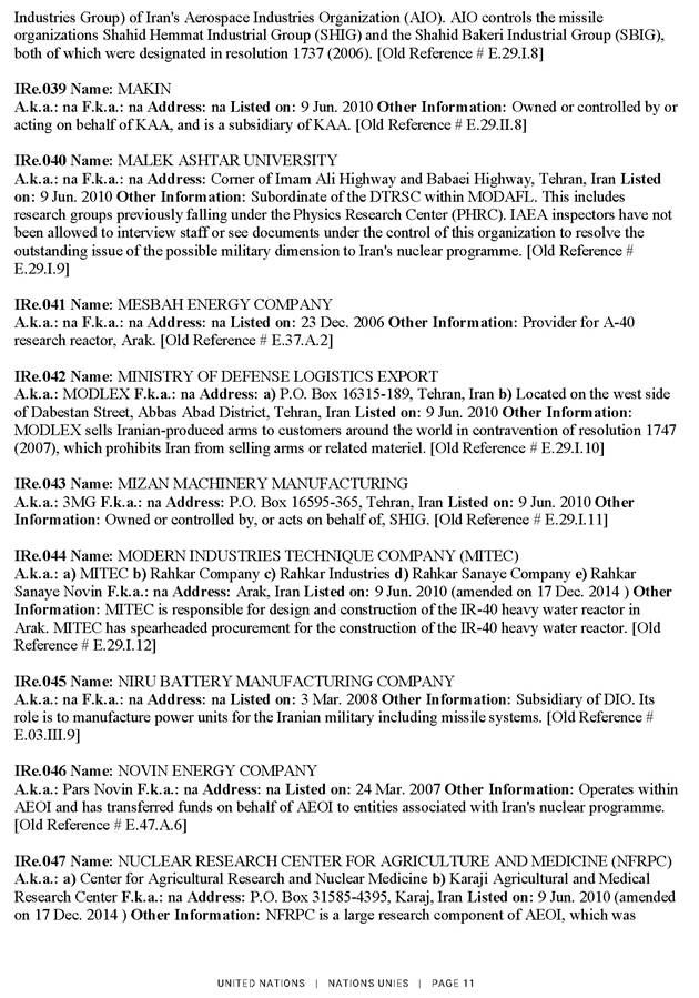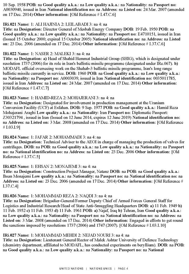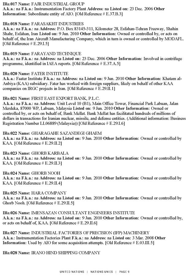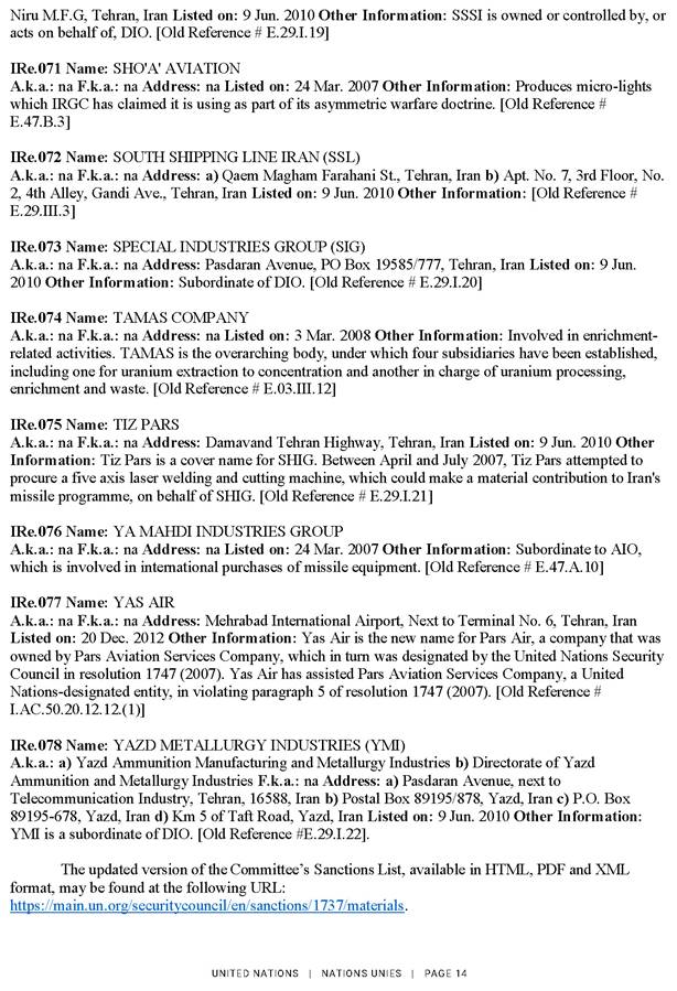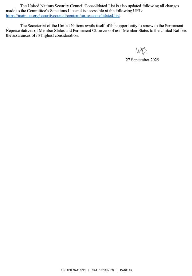 2025. gada 27. septembrī ANO Drošības padome saskaņā ar rezolūcijas Nr. 2231 (2015) 11. un 12. punktā noteikto atkārtoti piemēro visas rezolūciju Nr. 1696 (2006), Nr. 1737 (2006), Nr. 1747 (2007), Nr. 1803 (2008), Nr. 1835 (2008) un Nr. 1929 (2010) noteikumus tādā pašā apmērā, kādā tās bija spēkā pirms rezolūcijas Nr. 2231 (2015) pieņemšanas. Attiecīgi ANO Drošības padome saskaņā ar rezolūciju Nr. 1737 (2006) atkārtoti piemēroja sankcijas pret 43 fiziskām un 78 juridiskām personām. Lūgums skatīt ANO notu un skaidrojošo informāciju pielikumā.