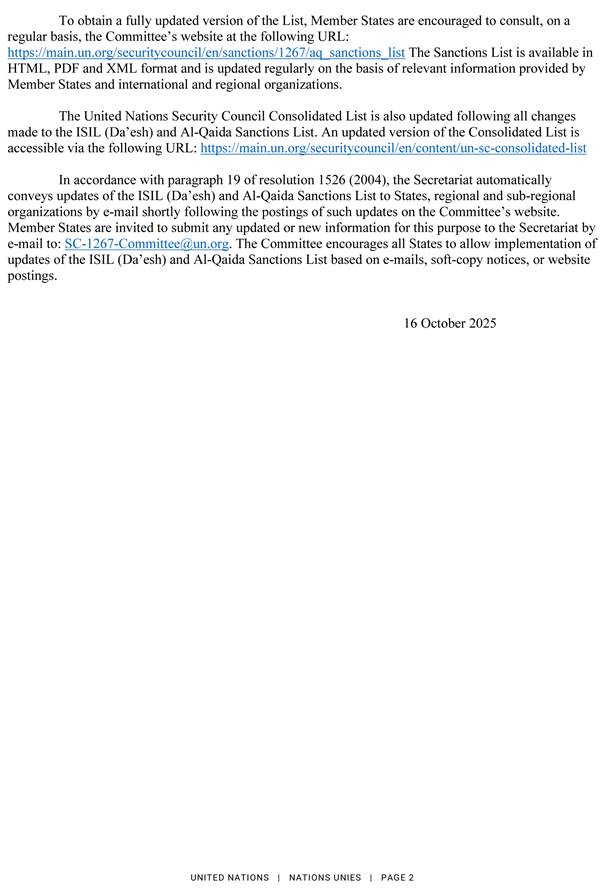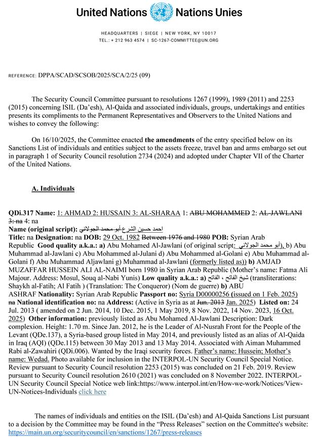 2025. gada 16. oktobrī ANO Drošības padome saskaņā ar rezolūcijām Nr. 1267 (1999), Nr. 1989 (2011) un Nr. 2253 (2015) grozīja informāciju par vienu Sīrijas pilsoni. Lūgums skatīt ANO notu un skaidrojošo informāciju pielikumā.