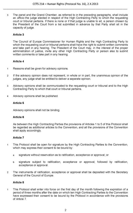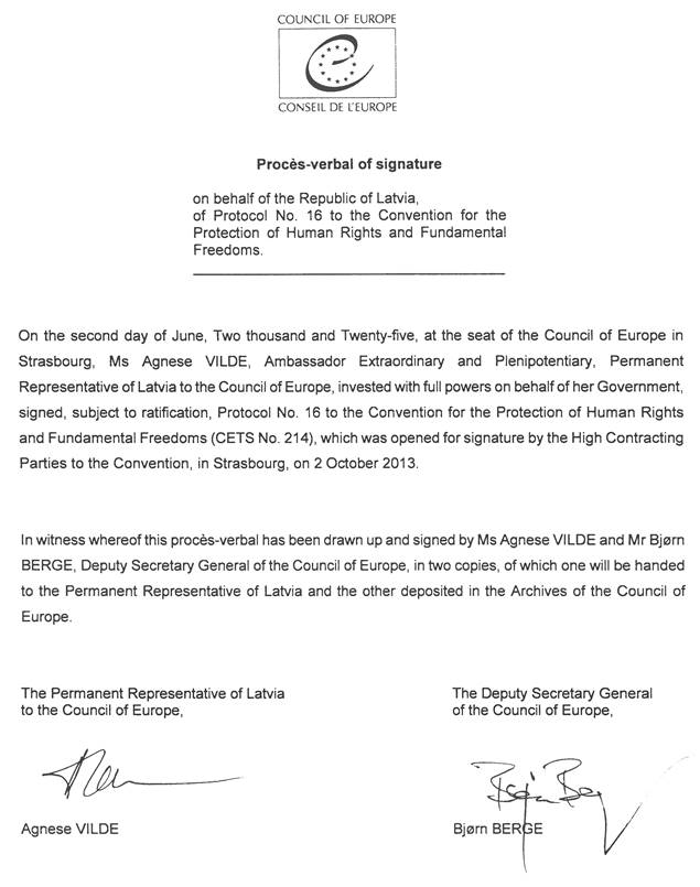 (2) Deponējot Eiropas Padomes ģenerālsekretāram Protokola pieņemšanas un apstiprināšanas instrumentu, Ārlietu ministrija tam pievieno deklarāciju, norādot šā panta pirmajā daļā minētās Latvijas Republikas izraudzītās tiesas.