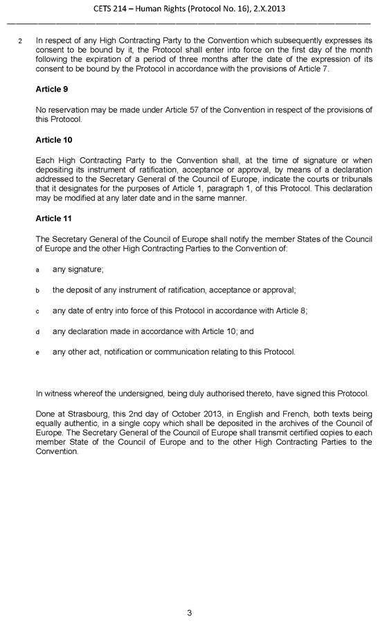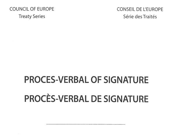 Parakstīts Strasbūrā 2013. gada 2. oktobrī angļu un franču valodā; abiem tekstiem esot vienlīdz autentiskiem, vienā eksemplārā, kas glabājas Eiropas Padomes arhīvā. Eiropas Padomes ģenerālsekretārs nosūta apliecinātas kopijas visām Eiropas Padomes dalībvalstīm un citām Konvencijas Augstajām Līgumslēdzējām Pusēm.