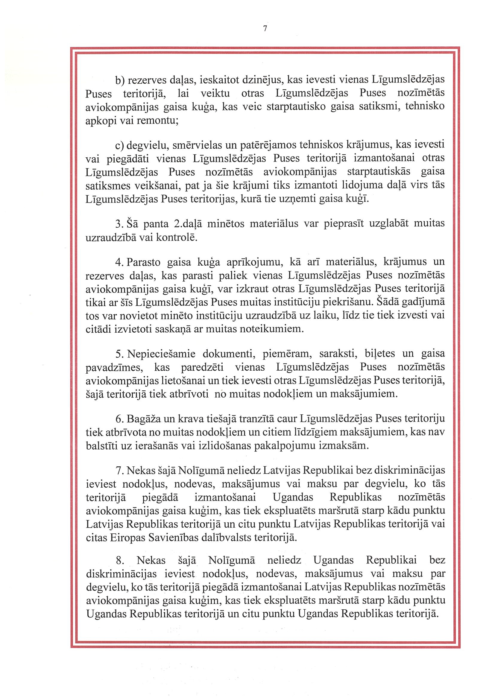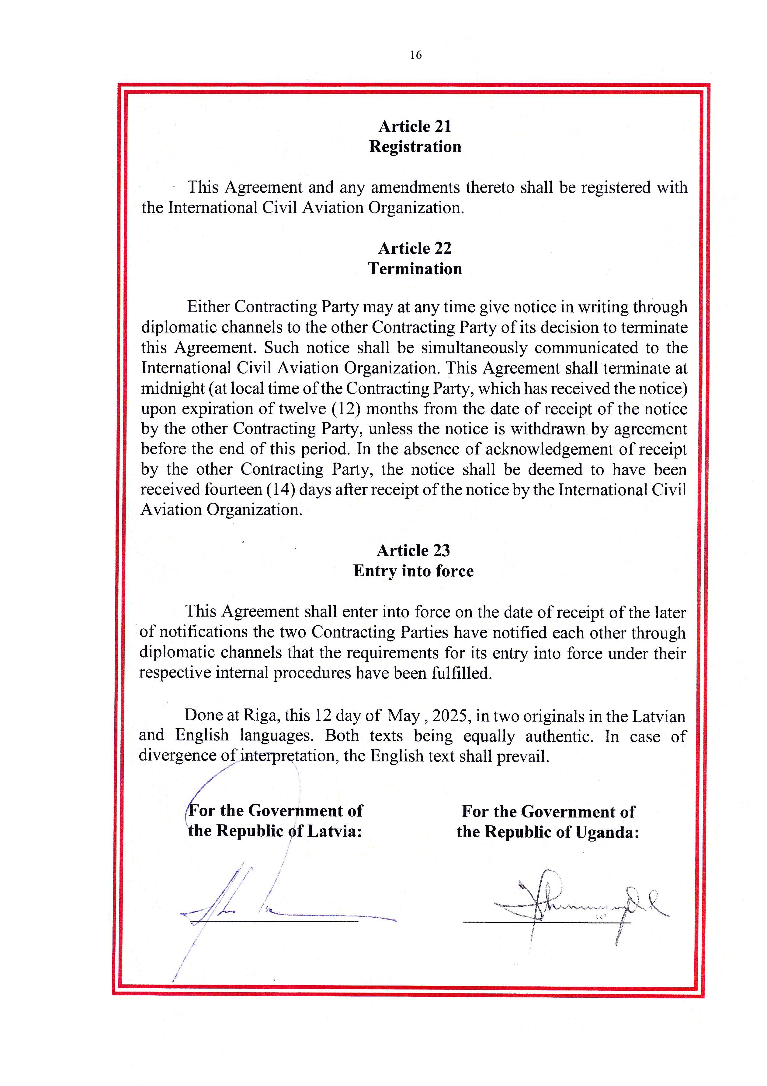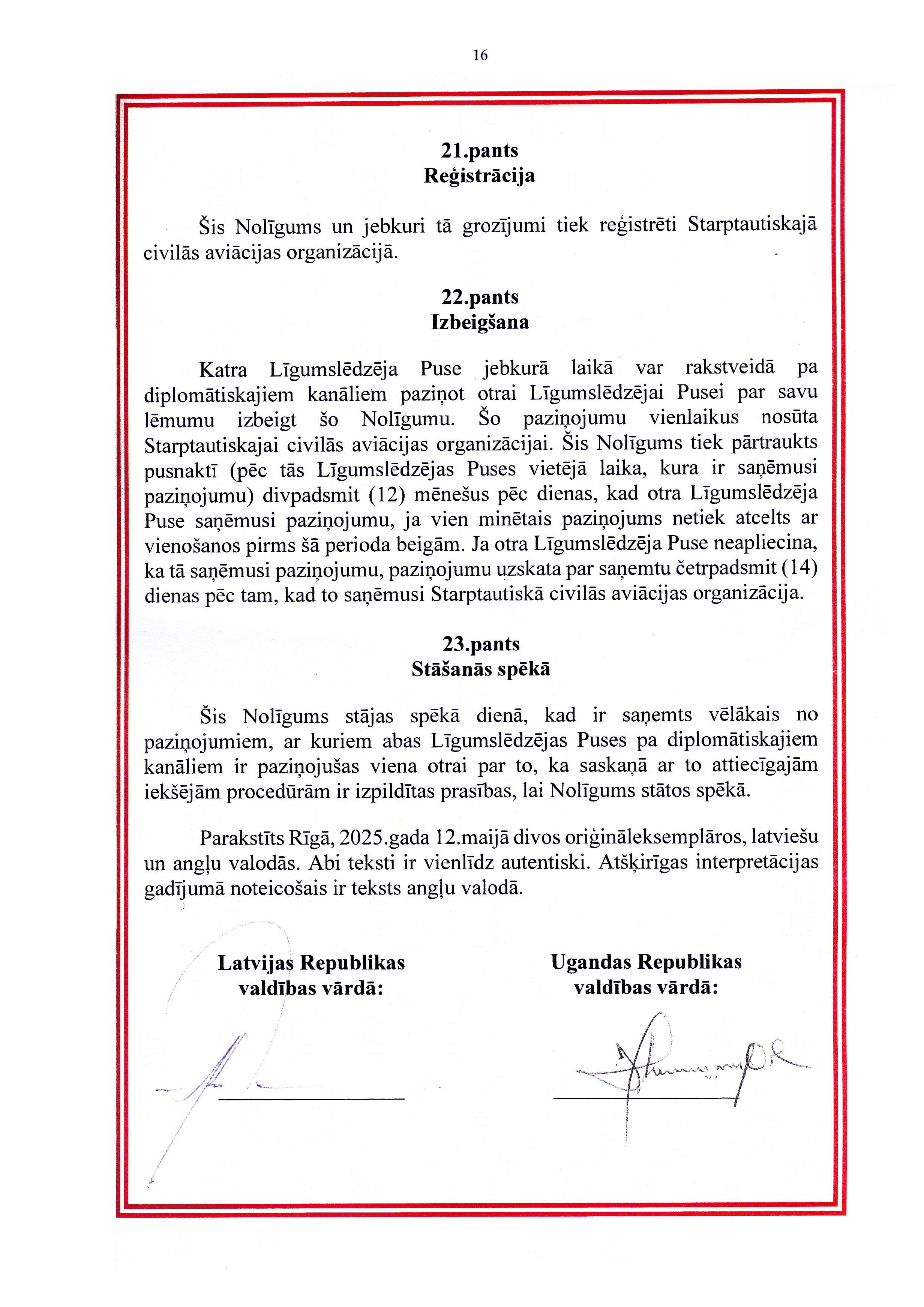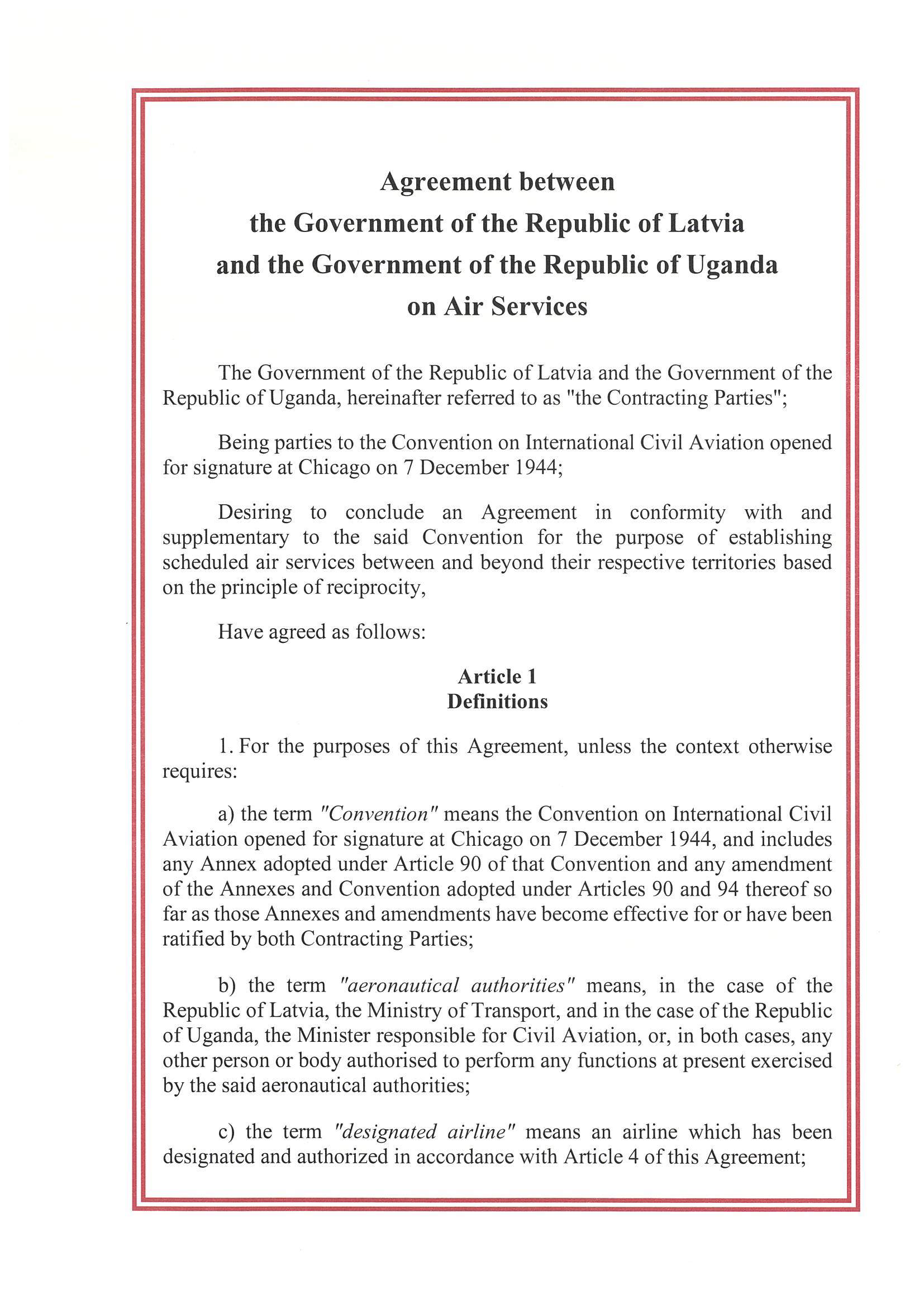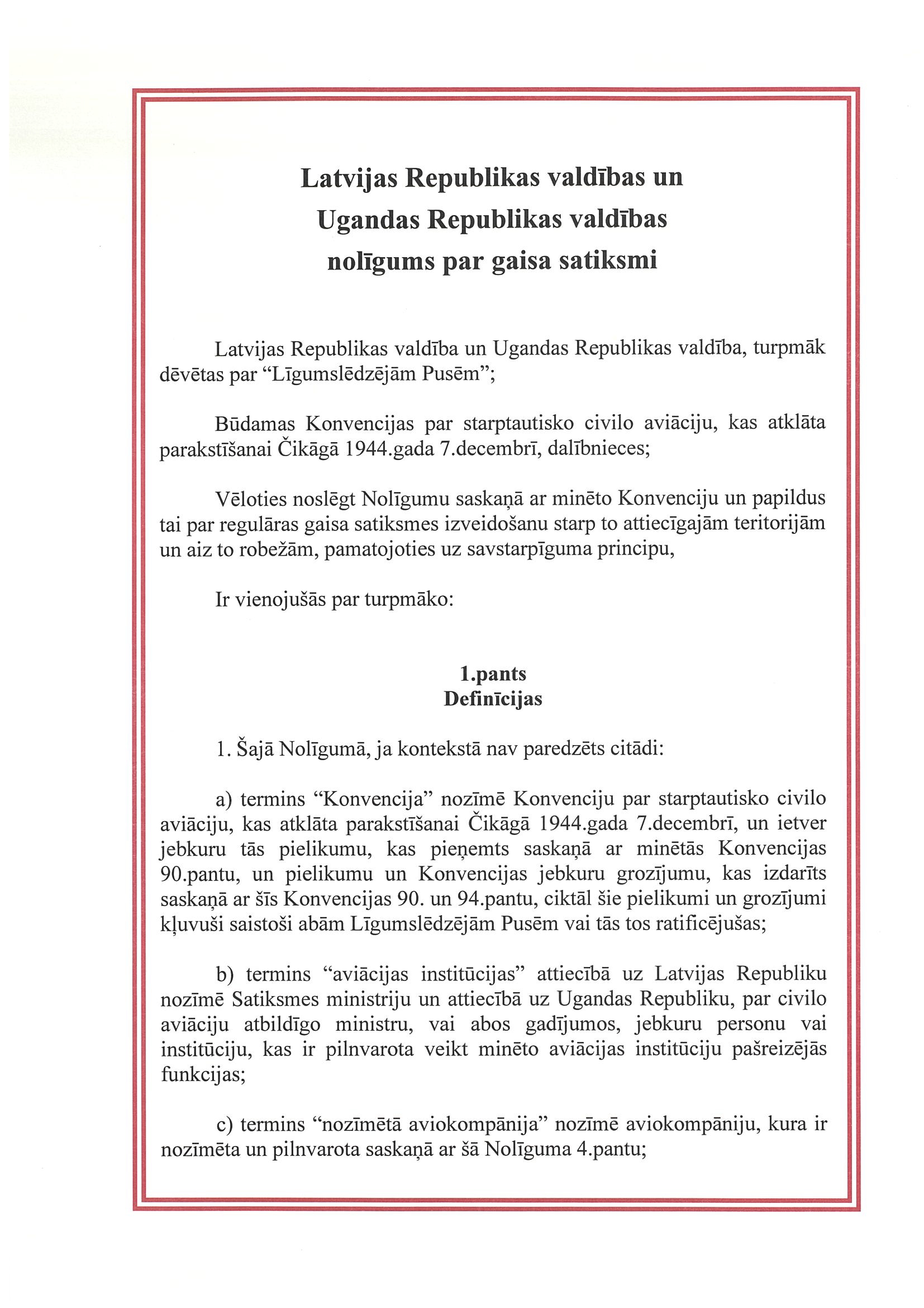 1. pants. 2025. gada 12. maijā Rīgā parakstītais Latvijas Republikas valdības un Ugandas Republikas valdības nolīgums par gaisa satiksmi (turpmāk - nolīgums) ar šo likumu tiek pieņemts un apstiprināts.