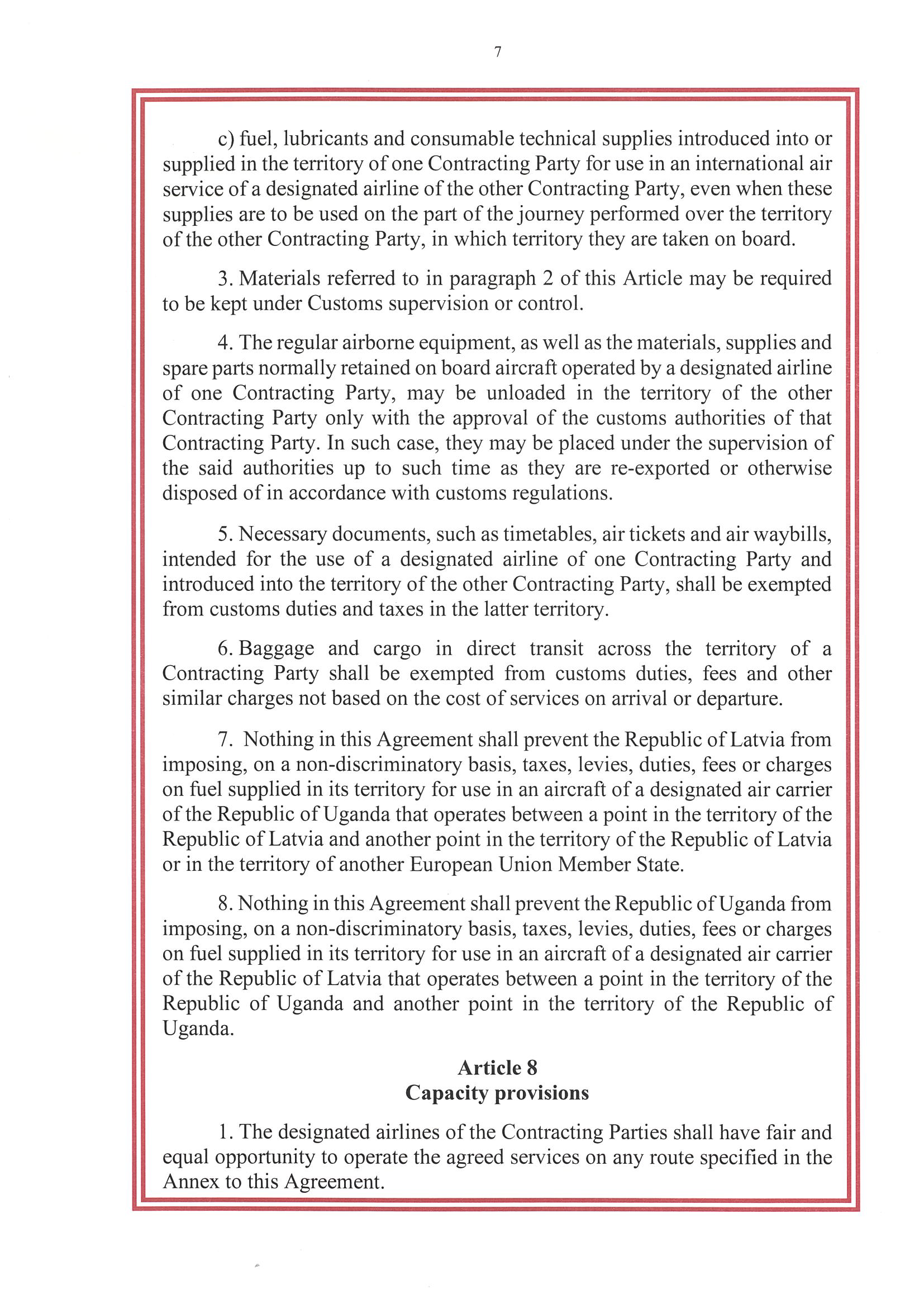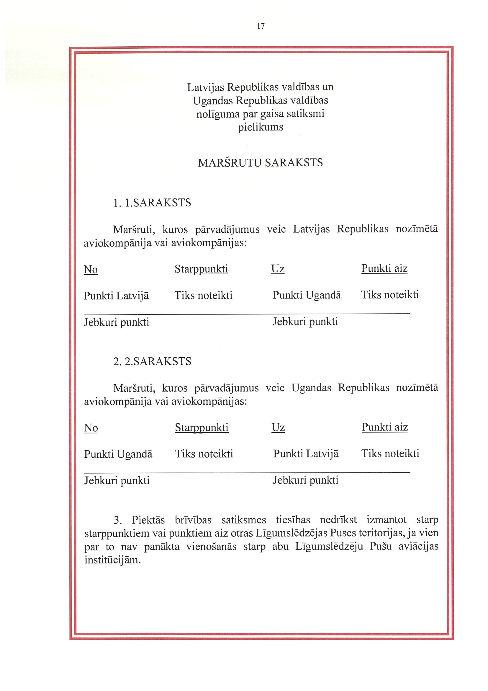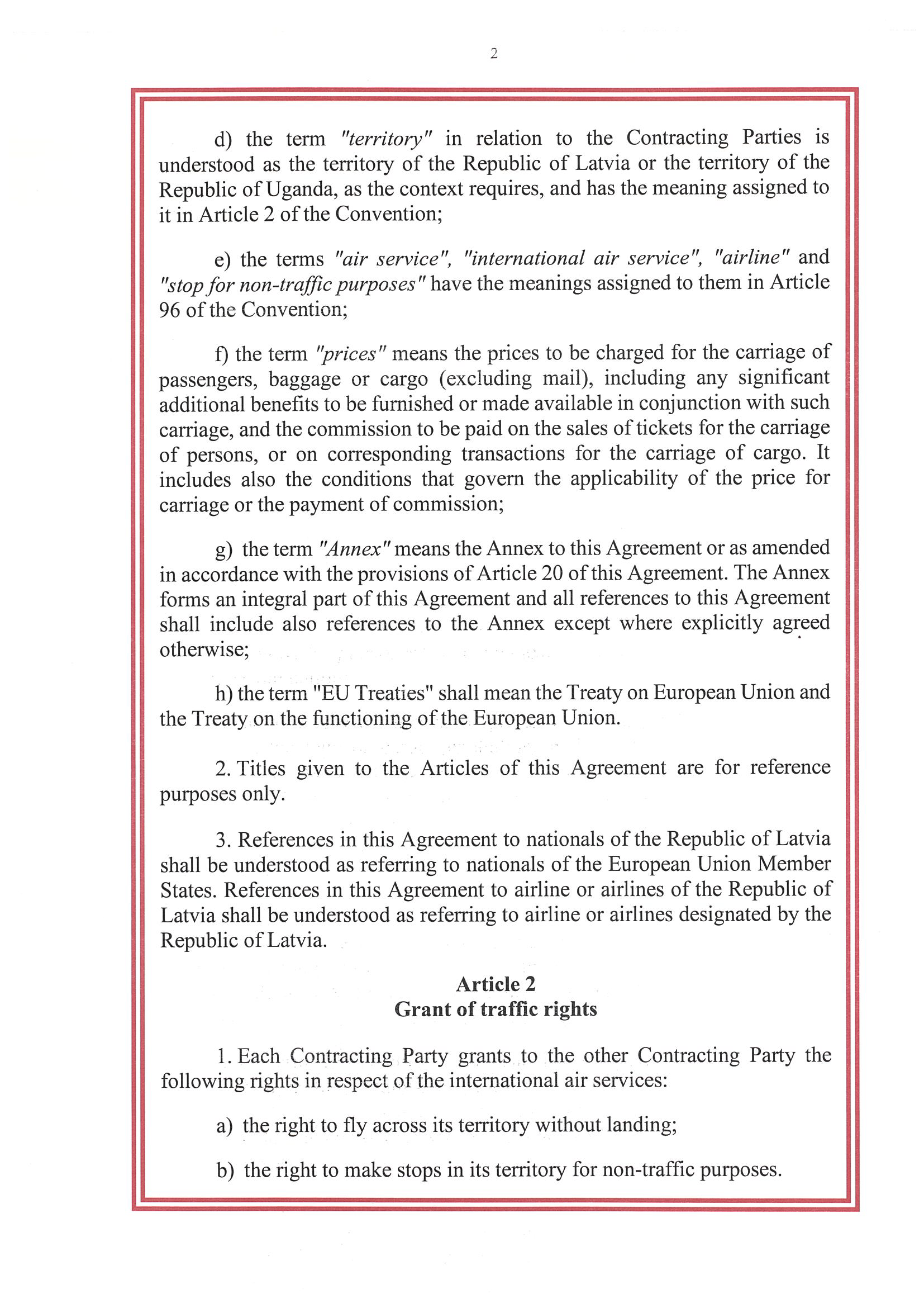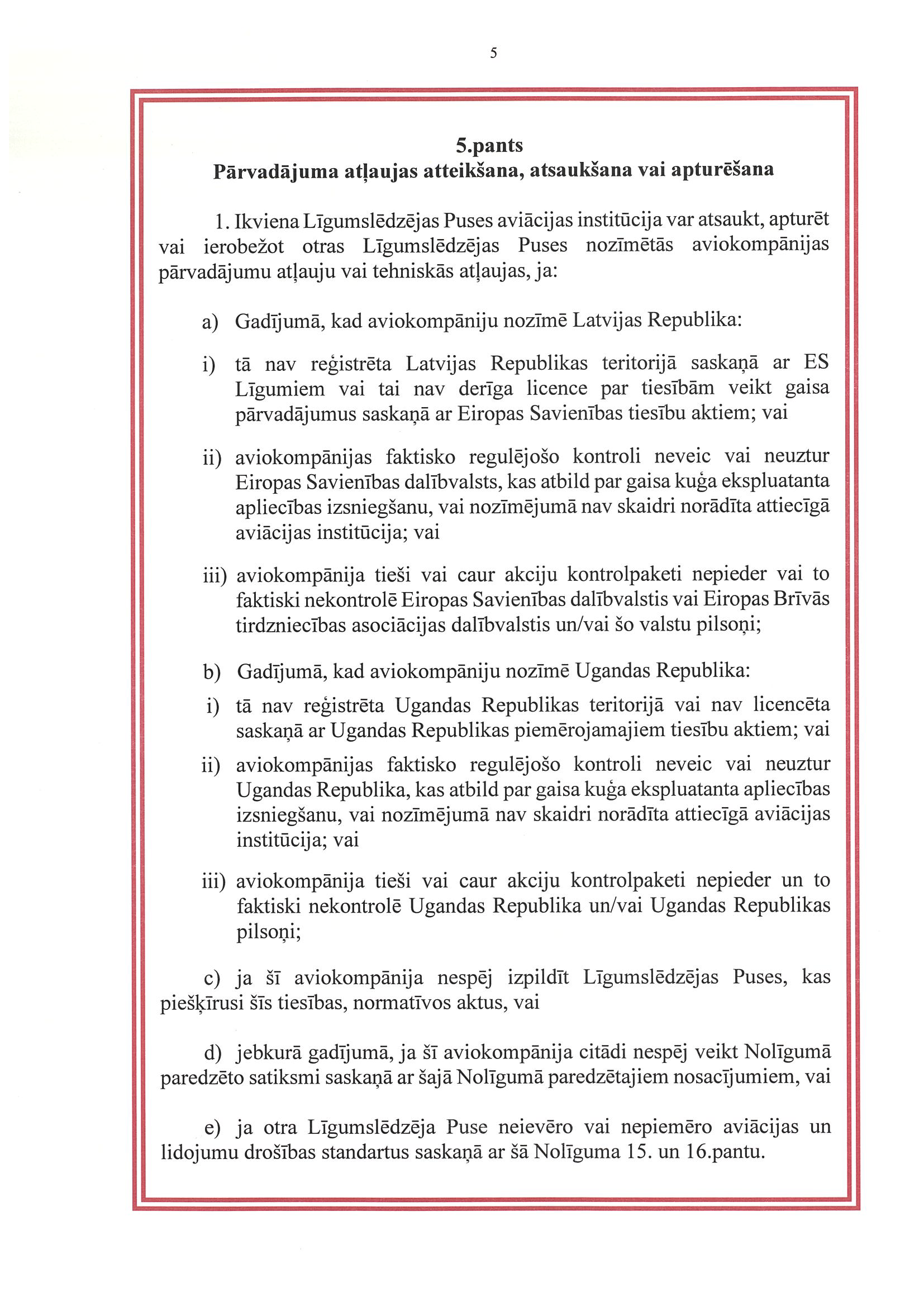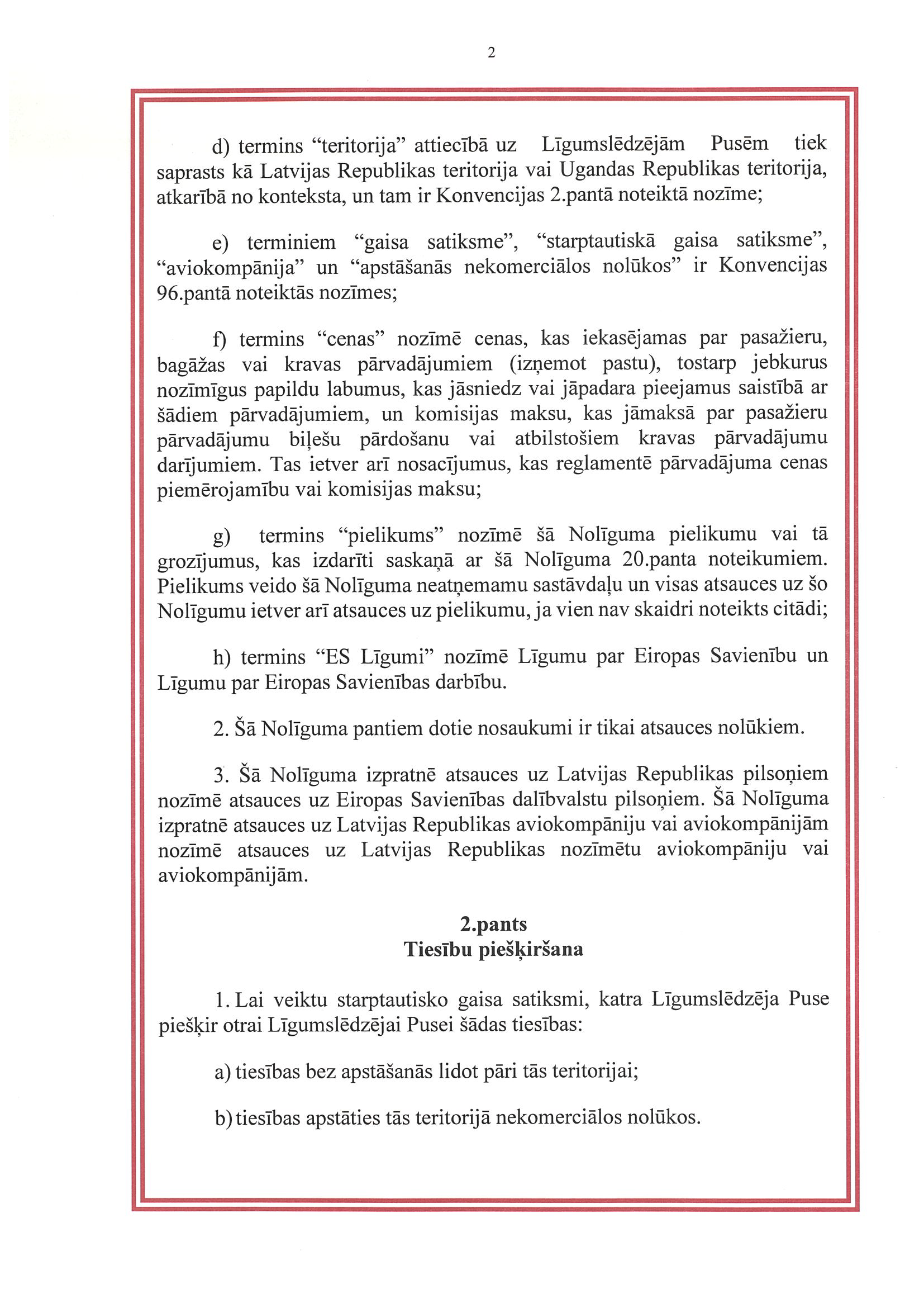 1. pants. 2025. gada 12. maijā Rīgā parakstītais Latvijas Republikas valdības un Ugandas Republikas valdības nolīgums par gaisa satiksmi (turpmāk - nolīgums) ar šo likumu tiek pieņemts un apstiprināts.