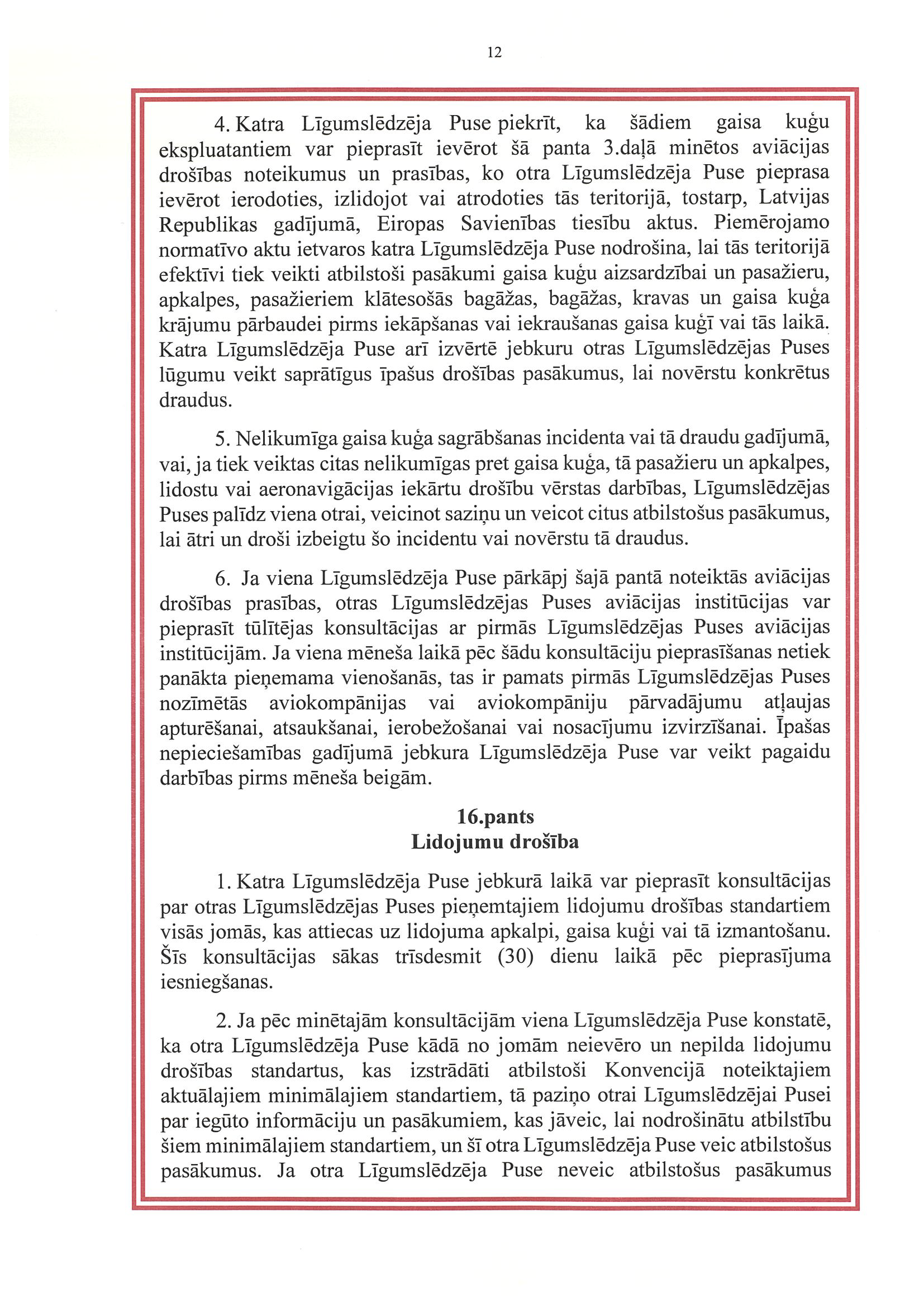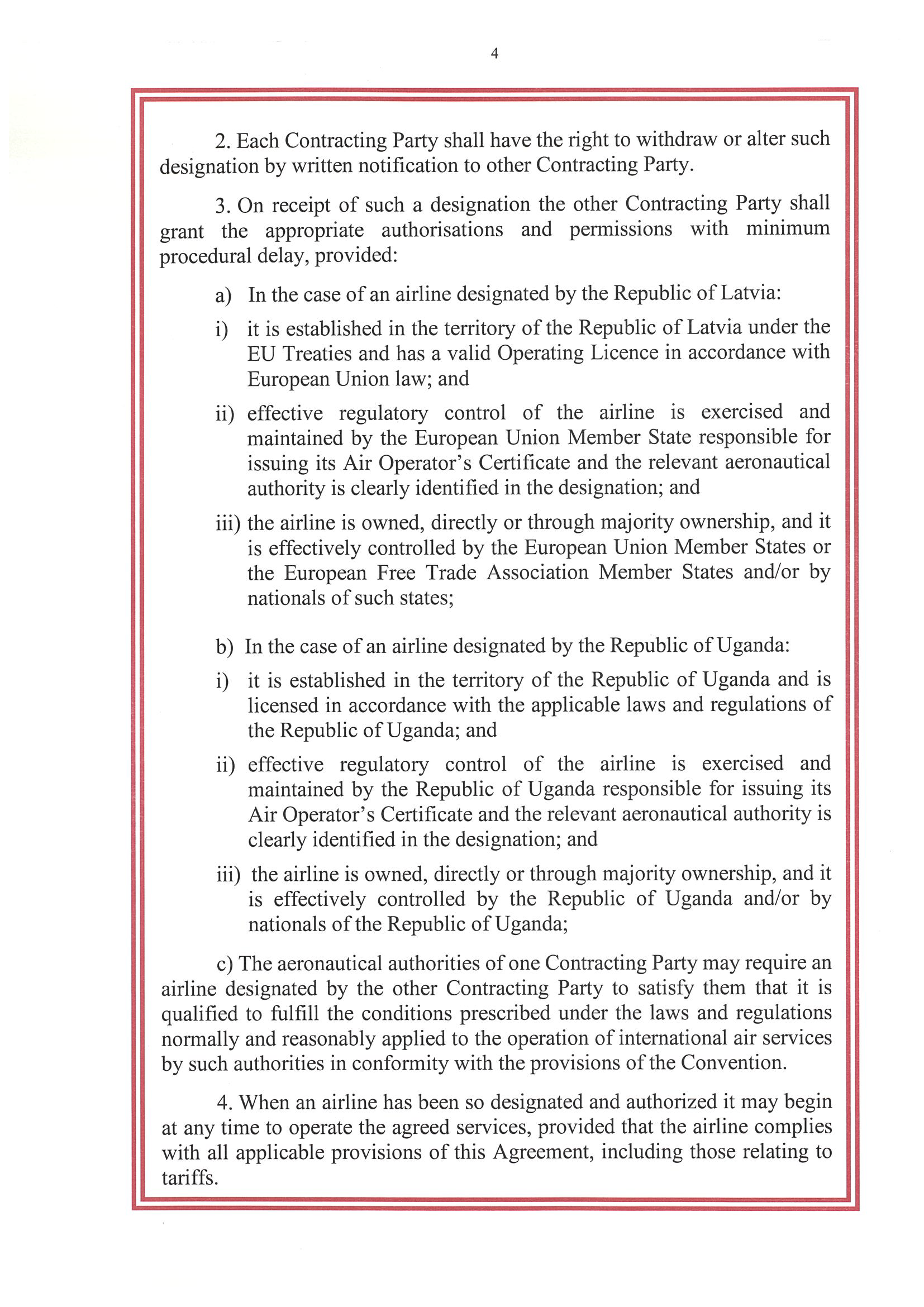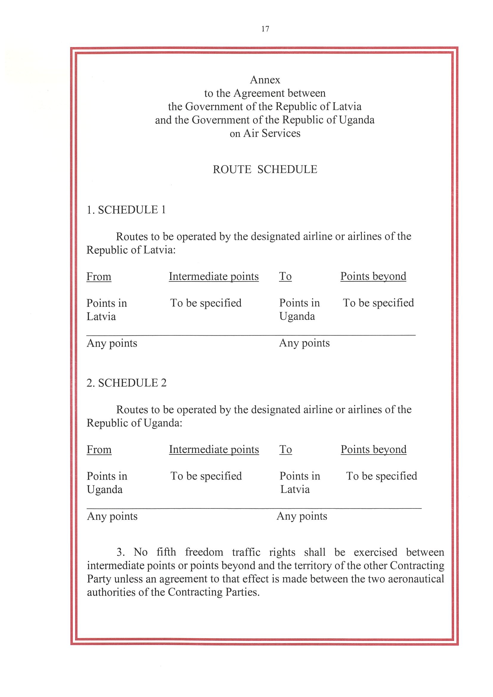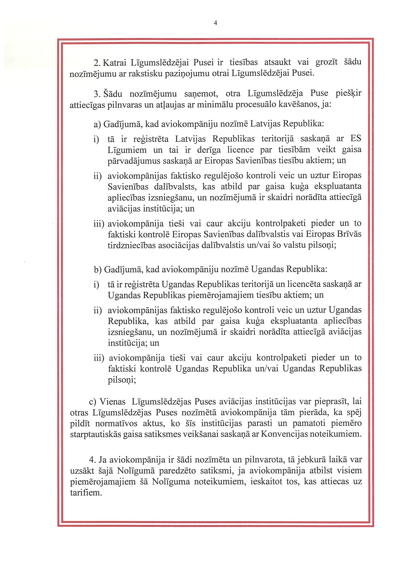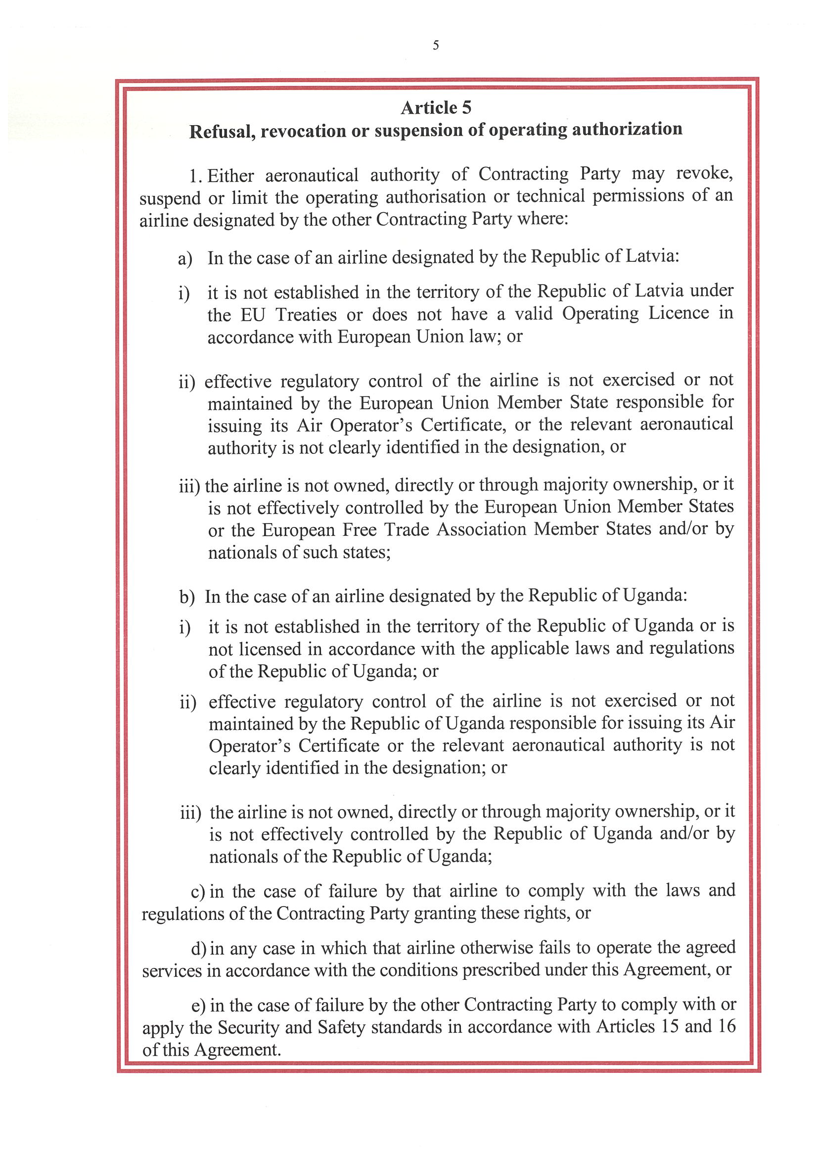 1. pants. 2025. gada 12. maijā Rīgā parakstītais Latvijas Republikas valdības un Ugandas Republikas valdības nolīgums par gaisa satiksmi (turpmāk - nolīgums) ar šo likumu tiek pieņemts un apstiprināts.