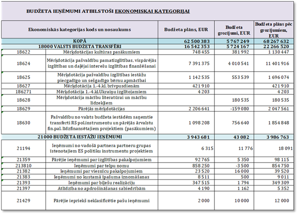 Ieņēmumu palielinājums vai samazinājums budžeta plānā ir fiksēts šajā tabulā uzskaitītajos ekonomiskās klasifikācijas kodos: