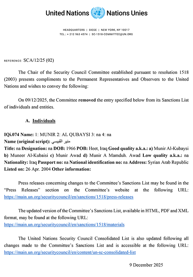2025. gada 9. decembrī ANO Drošības padome saskaņā ar rezolūciju Nr. 1518 (2003) atcēla sankcijas vienam Irākas pilsonim. Lūgums skatīt ANO notu un skaidrojošo informāciju pielikumā.