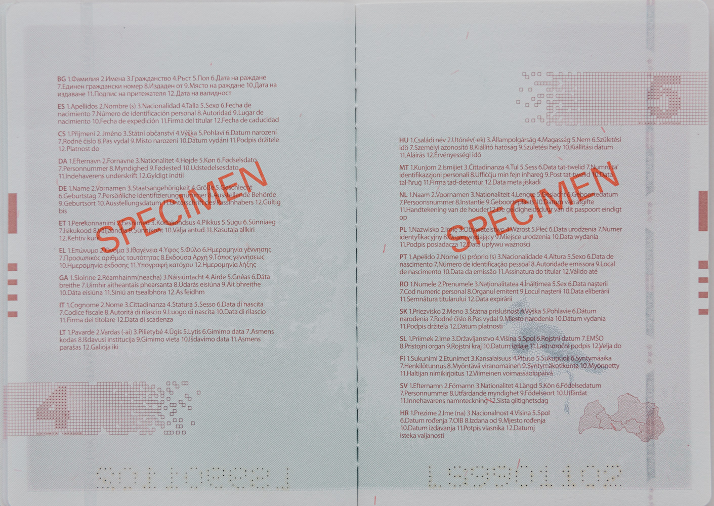 1. Kunjom 2. Ismijiet 3. Ċittadinanza 4. Tul 5. Sess 6. Data tat-twelid 7. Numru ta' identifikazzjoni personali 8. Uffiċċju min fejn inħareġ 9. Post tat-twelid 10. Data tal-ħruġ 11. Firma tad-detentur 12. Data meta jiskadi