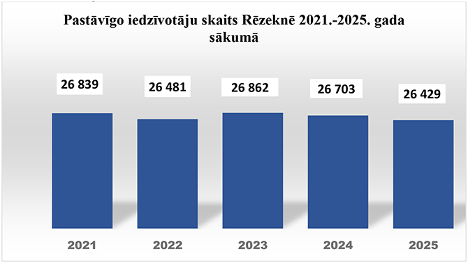 Pēdējo gadu laikā Rēzeknē iedzīvotāju skaita izmaiņām ir ilgstoša negatīva tendence (1.attēls). Pēc oficiālā statistikas portāla datubāzes informācijas, 2025. gada sākumā Rēzeknes pilsētā bija 26 429 iedzīvotāji. Tas ir par 274 iedzīvotājiem mazāk nekā 2024. gada sākumā un par 410 iedzīvotājiem mazāk nekā 2021. gada sākumā.