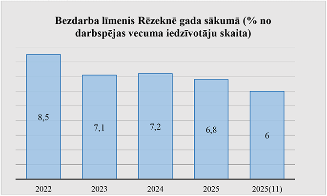 Bezdarba līmenis Rēzeknes pilsētā, pēc Nodarbinātības valsts aģentūras pieejamās informācijas uz 2025. gada 30. novembri bija 6,0 % no kopējā ekonomiski aktīvo iedzīvotāju skaita. Salīdzinot ar 2025. gada 1. janvāri publicēto informāciju, secināms, ka bezdarba līmenis nepilna gada laikā Rēzeknē samazinājies par 0,8 %.