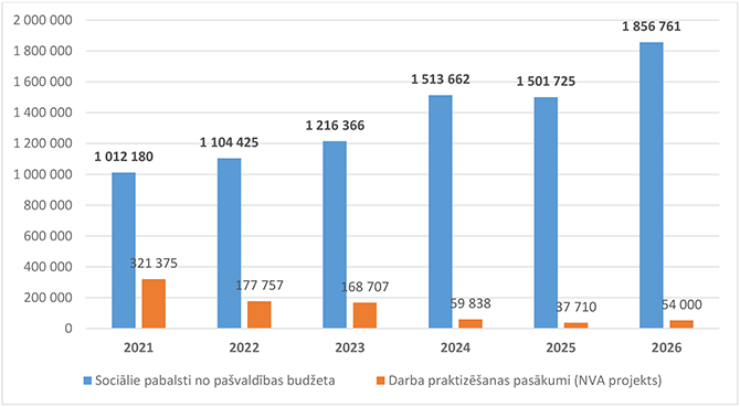 • GMI pabalsta saņēmēju skaits būtiski nemainīsies, bet pieaugot GMI pabalsta līmeņa apmēram ar 01.01.2026. no 166 euro uz 187 euro, pabalsta apmērs 2026. gadam plānots - 421 269 euro, kas par 24 934 euro vairāk nekā 2025. gadā;