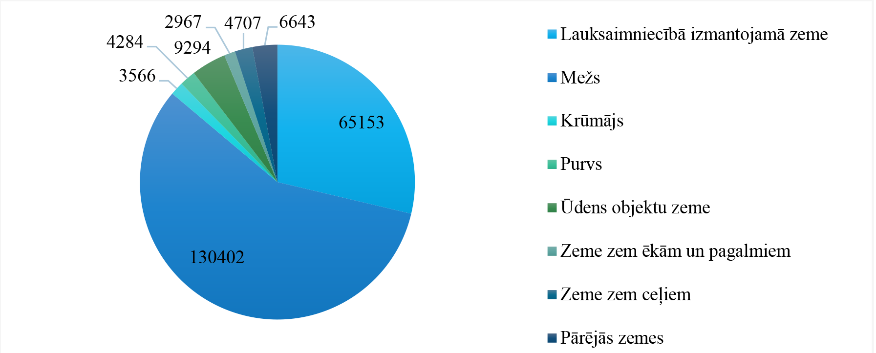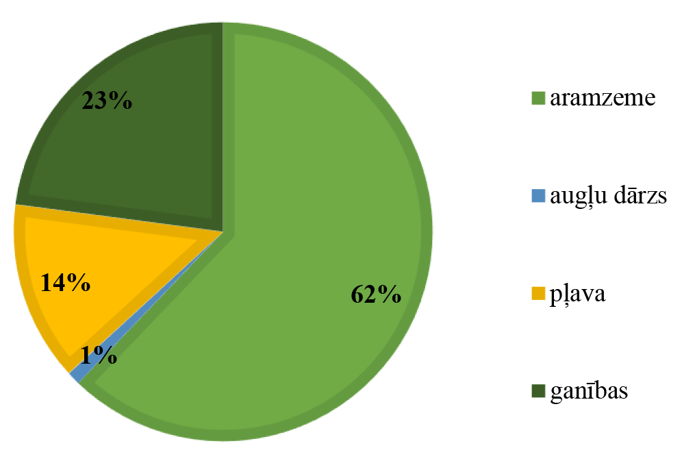 No lauksaimniecībā izmantojamās zemes lielāko daļu sastāda aramzeme (40 505 ha jeb 62 %), mazāk ganības (14 923 ha jeb 23 %), pļavas (9 058 ha jeb 14 %) un augļu dārzi (667 ha jeb 1 %).