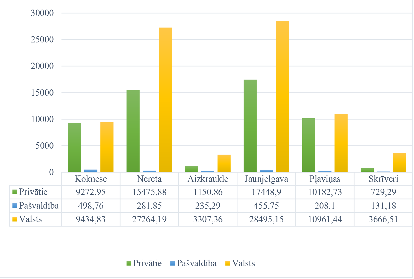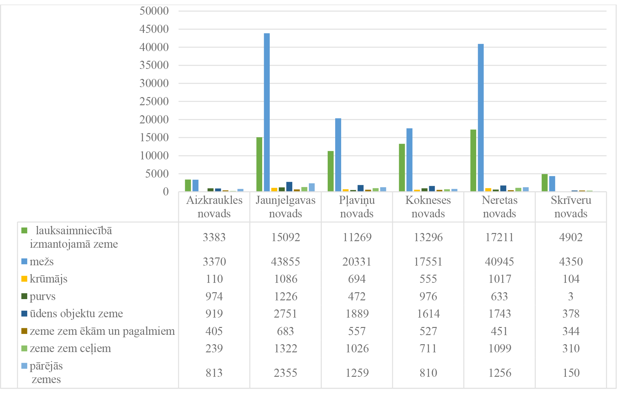 Visvairāk meža zemes ir Jaunjelgavas un Neretas apvienībās. Lauksaimniecībā izmantojamā zeme līdzīgā platībā ir Jaunjelgavas (15 092 ha), Kokneses (13 296 ha) un Pļaviņu apvienībās (11 269 ha).