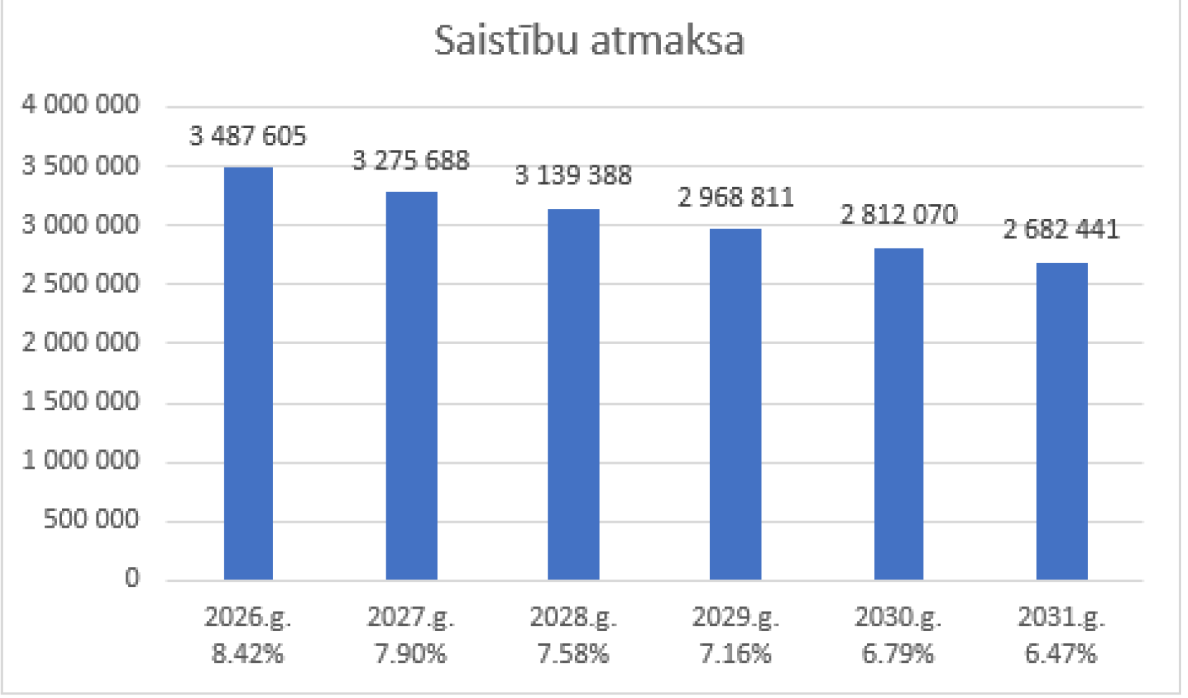 Kopējais saistību apjoms, t.i., pamatsummu atmaksa, kopā ar apkalpošanas maksu un procentu maksājumiem, 2026. gadā sastāda 3 397 977 euro, kas ir 9.60 % no plānotajiem pamatbudžeta ieņēmumiem (bez plānotajiem transferta ieņēmumiem no valsts budžeta noteiktam mērķim), un tuvākajos 5 gados šo saistību apjoms ir 7 % - 9 % robežās.