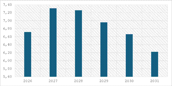 Kopējais saistību apjoms, t.i. pamatsummu atmaksa kopā ar apkalpošanas maksu un procentu maksājumiem, 2026. gadā veido 881 898 EUR, un tuvākajos 3 gados šo saistību apjoms ir 6 % - 7 % robežās.