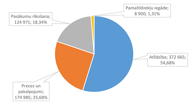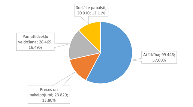 Lielākais īpatsvars ir izdevumiem atlīdzības nodrošināšanai 2 512 675 EUR, kas ir 44,30 % no sociālai aizsardzībai 2026. gadam plānotā finansējuma.