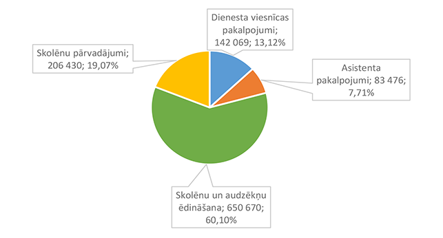 Lielākais īpatsvars ir skolēnu ēdināšanas pakalpojumam 650 670 EUR, kas ir 60,10 % no papildu izglītības pakalpojumiem 2026. gadam plānotā finansējuma.