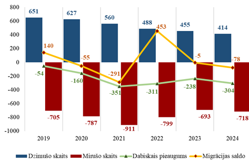 1.1. attēls. Iedzīvotāju dabiskā un mehāniskā kustība Jelgavas valstspilsētā 2019.-2024.