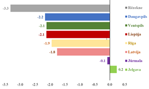1.2. attēls. Pastāvīgo iedzīvotāju skaits un tā izmaiņas 7 valstspilsētās un Latvijā 2026. gada sākumā salīdzinājumā ar 2025. gada sākumu, %.