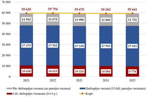 PMLP dati (1.3. attēls) liecina, ka Jelgavā 2025. gadā, salīdzinot ar iepriekšējo, 2024. gadu, palielinājies iedzīvotāju skaits darbspējas vecumā - par 379 un pēc darbspējas vecuma iedzīvotāju skaits - par 65, bet samazinājies iedzīvotāju skaits līdz darbspējas vecumam - par 306. Savukārt, pēdējo 5 gadu laikā - periodā no 2021.-2025. gadam - iedzīvotāju skaits līdz darbspējas vecumam Jelgavā ir samazinājies par 8,1 %, bet palielinājies darbspējas vecumā - par 1,2 % un pēc darbspējas vecuma - par 1,9 %. Turpinās sabiedrības novecošanās un ilgtermiņā prognozējama darbaspējas vecuma iedzīvotāju skaita samazināšanās, palielinoties demogrāfiskai slodzei pilsētā.