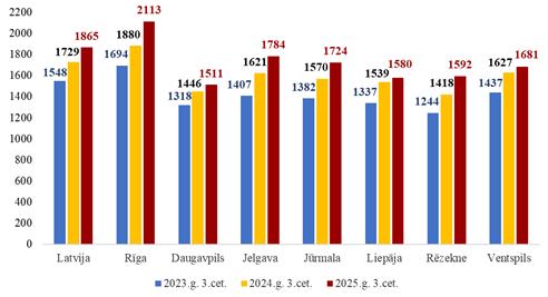 Taču 2025. gada pirmajos trīs ceturkšņos, salīdzinot ar iepriekšējā gada attiecīgo periodu, iekšzemes kopprodukta (IKP) pieaugums sasniedza 1,7 %, kas saspringtas ģeopolitiskās situācijas apstākļos vērtējams pozitīvi. Ekonomikas izaugsmi veicināja gan mēreni straujāka izaugsme galvenajās tirdzniecības partnervalstīs, gan dažādi pasākumi ekonomikas stimulēšanai, īpaši kreditēšanas un investīciju jomā. Lielāko devumu izaugsmē nodrošināja investīciju pieaugums, ko sekmēja gan straujāka ES fondu līdzekļu apguve, gan privātā sektora kreditēšanas aktivizēšanās. Eksporta dinamika bija nevienmērīga - preču eksports gandrīz saglabājās nemainīgs, savukārt pakalpojumu eksports pieauga. Lai gan ārējā vide nedaudz uzlabojās, tā joprojām ir vāja pastāvošās ģeopolitiskās nenoteiktības dēļ. Vienlaikus privātā patēriņa attīstību ierobežoja augstais cenu līmenis, inflācijas gaidas un nenoteiktā ģeopolitiskā situācija1.