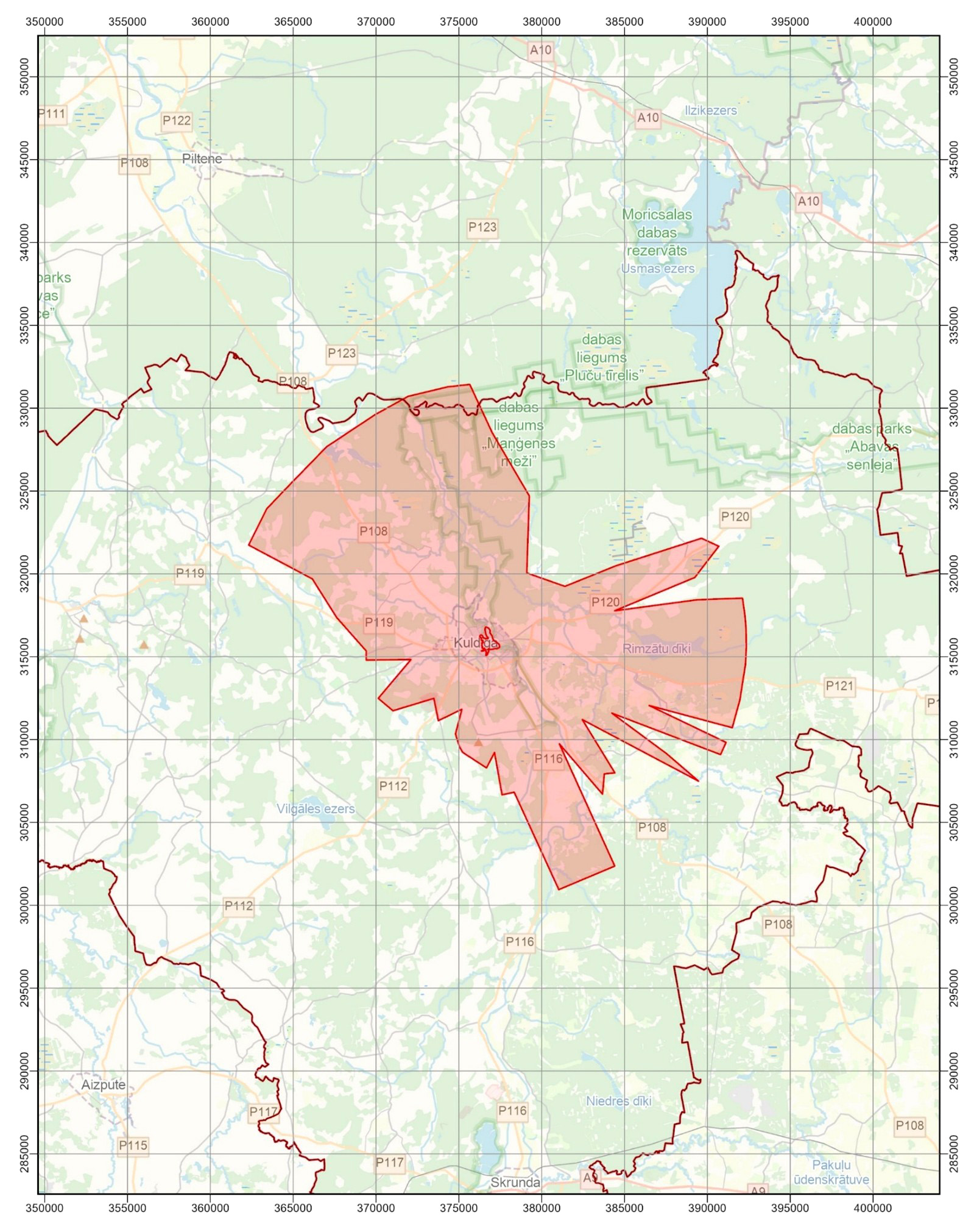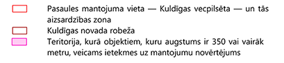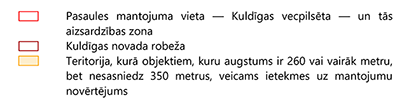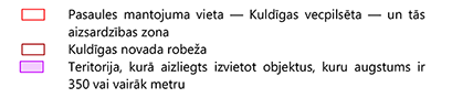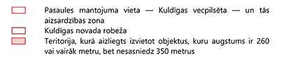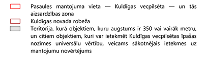 Lai novērstu vai mazinātu negatīvo ietekmi uz saglabājamām un aizsargājamām Kuldīgas vecpilsētas vērtībām (it īpaši pilsētas siluetu, panorāmu un skatu perspektīvām), kā arī saglabātu vēsturiskās ainavas integritāti un novērstu vai mazinātu tās piesārņojumu, Kuldīgas vecpilsētas ainavas un citu īpašas nozīmes universālas vērtības elementu aizsardzības nolūkā ir noteiktas šādas prasības attiecībā uz: