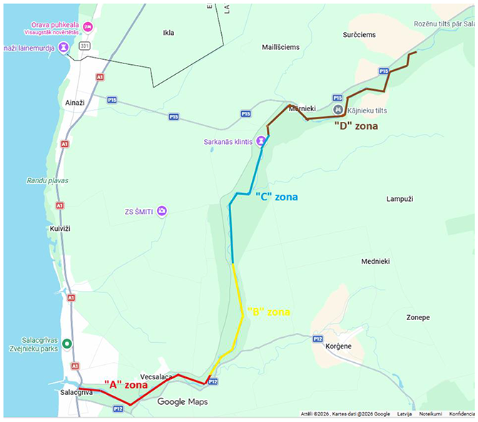 6.1. "A" zona - no tilta pār Salacas upi Salacgrīvā (GPS: 57.754751, 24.361067) uz augšu pret straumi līdz Korģes upes ietekai (GPS: 57.758254, 24.450545);