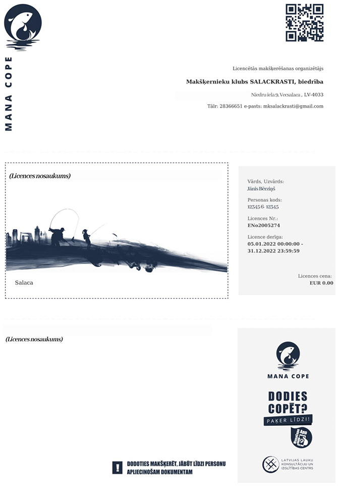 58. Pielikums Nr. 2 - Licencētās makšķerēšanas un vēžošanas elektroniskās licences paraugs.