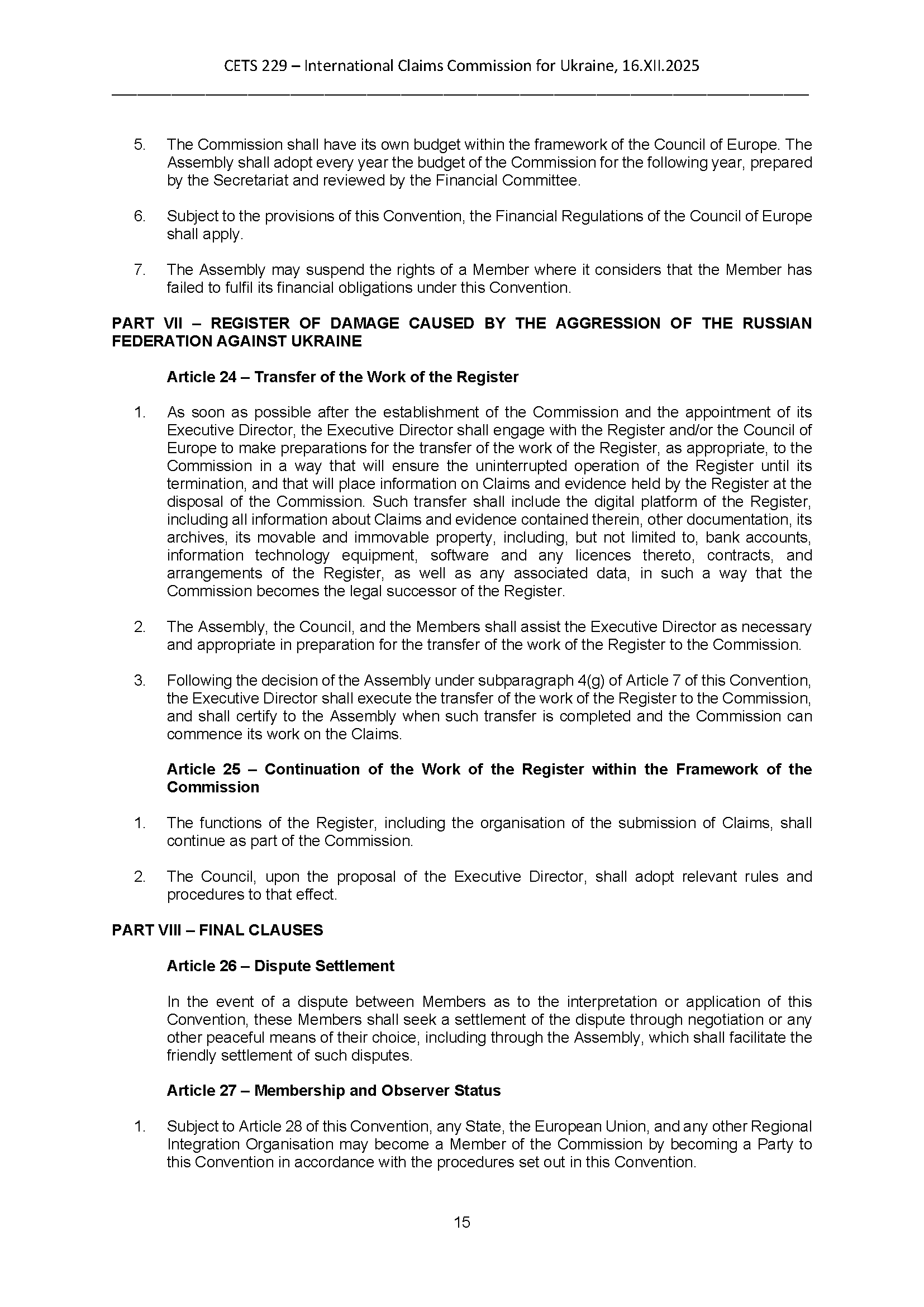 atzīmējot, ka šī konvencija ir šāds starptautisks dokuments un ka ar to tiek izveidota Starptautiskā Prasību komisija Ukrainai, kas ir starptautiskā kompensācijas mehānisma otrais elements, un kurā kā trešo elementu var iekļaut arī turpmāku kompensāciju fondu, kam uzdots izmaksāt kompensācijas par zaudējumiem, kaitējumu vai aizskārumu, ko radījušas Krievijas Federācijas starptautiski prettiesiskās darbības Ukrainā vai pret Ukrainu;