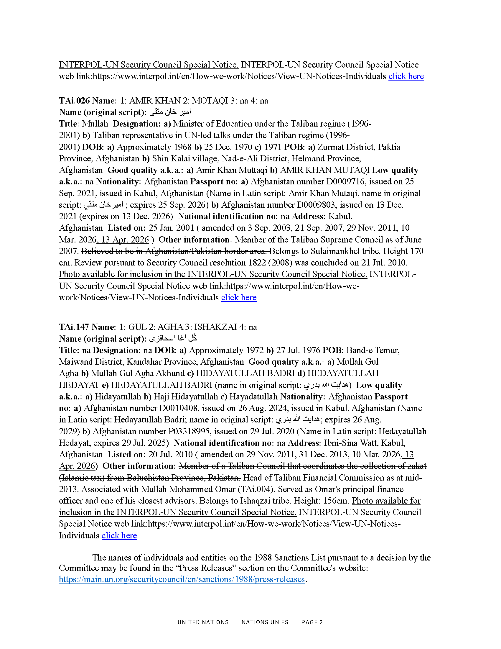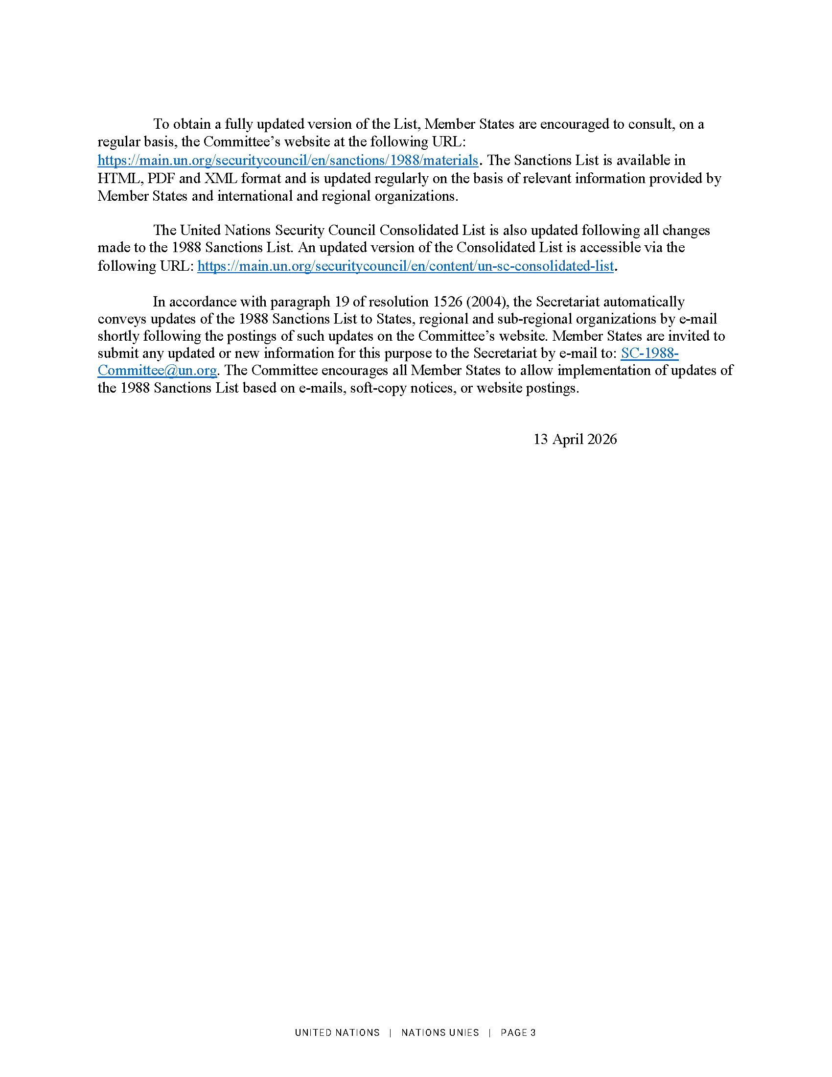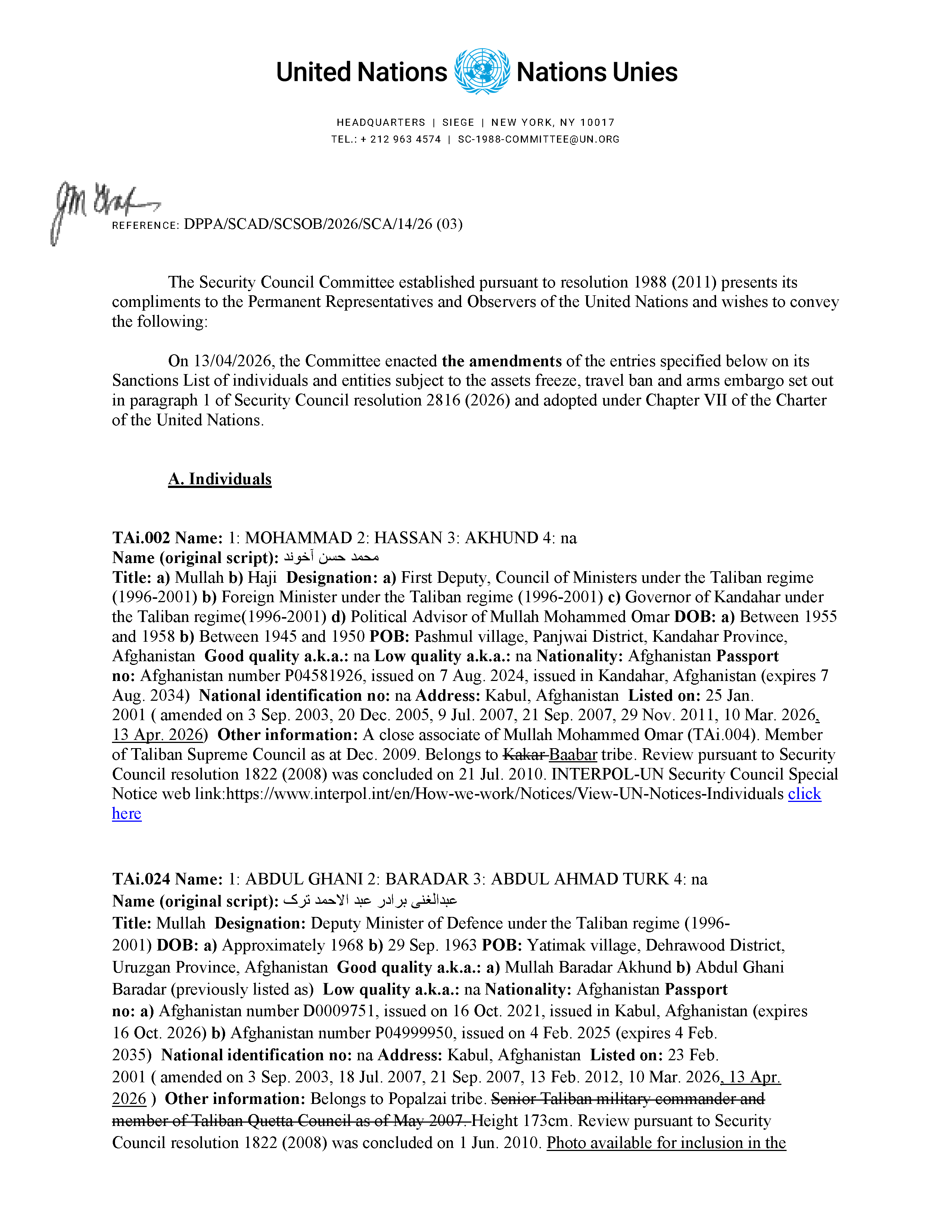 2026. gada 13. aprīlī ANO Drošības padome saskaņā ar rezolūciju Nr. 1988 (2011) grozīja informāciju par četriem Afganistānas pilsoņiem. Lūgums skatīt ANO notu un skaidrojošo informāciju pielikumā.