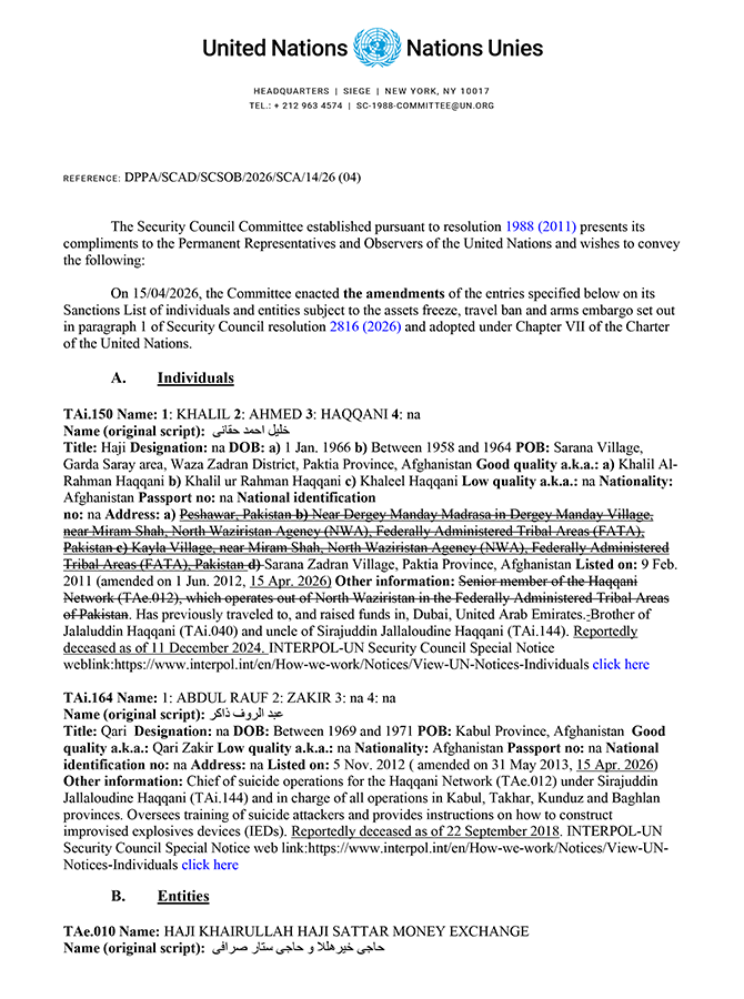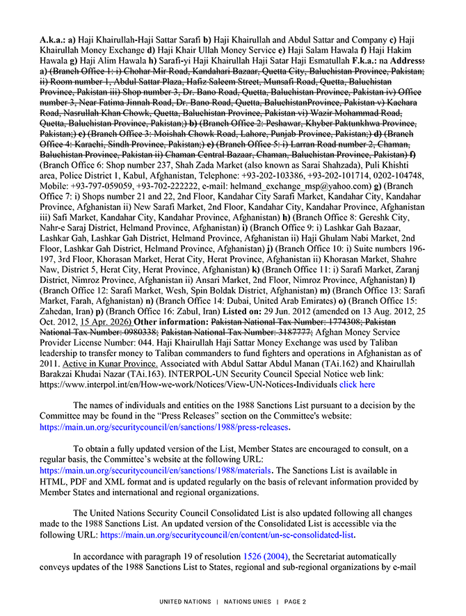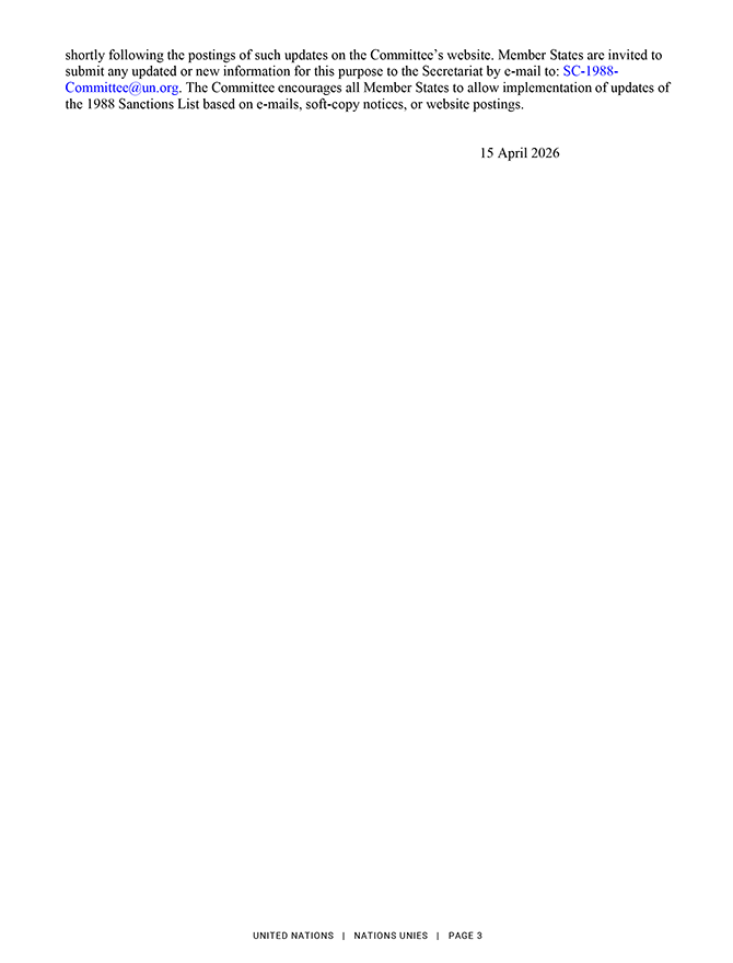 2026. gada 15. aprīlī ANO Drošības padome saskaņā ar rezolūciju Nr. 1988 (2011) grozīja informāciju par diviem Afganistānas pilsoņiem un vienu Afganistānā, Irānā un Apvienotajos Arābu Emirātos reģistrētu juridisko personu. Lūgums skatīt ANO notu un skaidrojošo informāciju pielikumā.