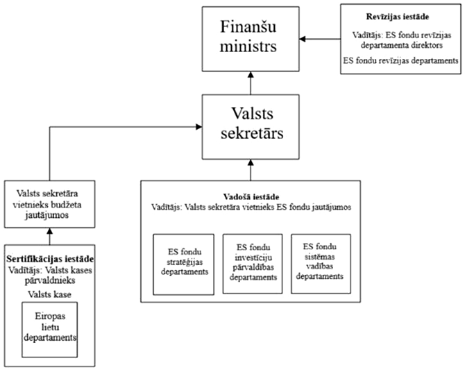 Vadošās iestādes statusā rīkojas trīs šādi Latvijas Republikas Finanšu ministrijas departamenti:
