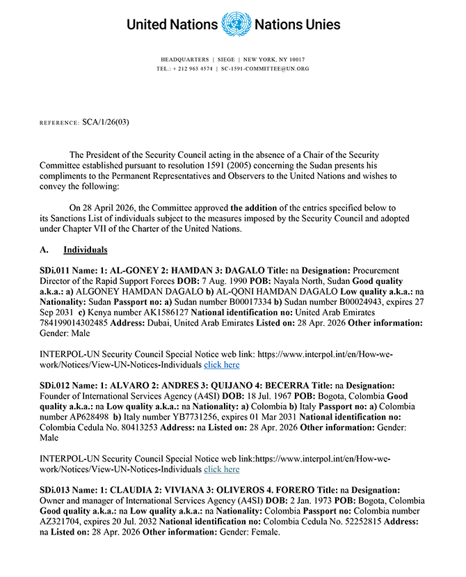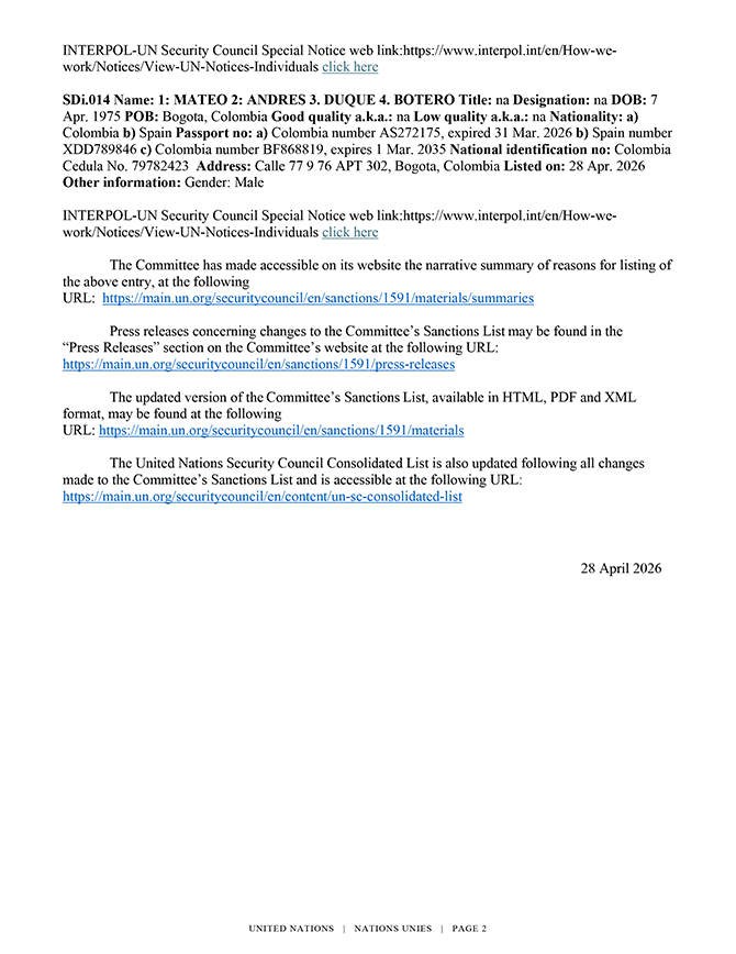 2026. gada 28. aprīlī ANO Drošības padome saskaņā ar rezolūciju Nr. 1591 (2005) noteica sankcijas pret vienu Sudānas pilsoni, vienu Kolumbijas un Itālijas dubultpilsoni, vienu Kolumbijas pilsoni, vienu Kolumbijas un Spānijas dubultpilsoni. Lūgums skatīt ANO notu un skaidrojošo informāciju pielikumā.